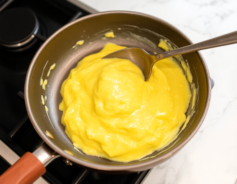 - While the croissants are toasting, prepare your eggs using a soft scramble technique. Cook them in a skillet over medium-low heat, gently stirring to form soft curds without overcooking.