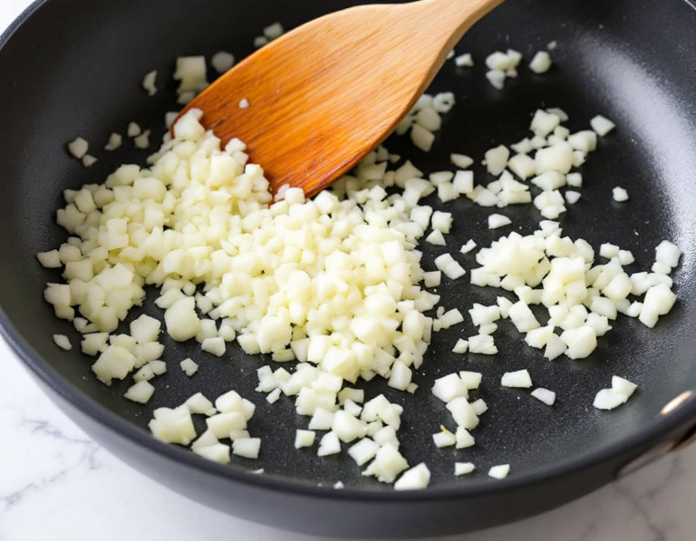 - Add minced garlic to the onions and cook for about 30 seconds. Transfer the mixture to a medium bowl, allowing the flavors to meld.